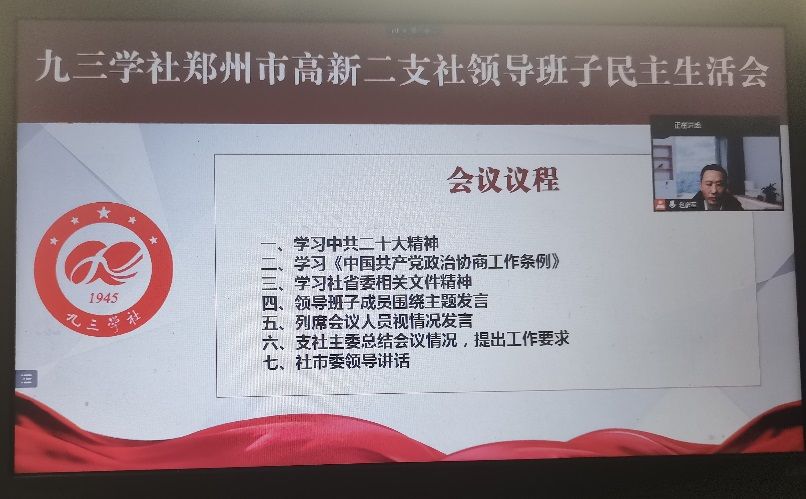 2022年10月29日上午,九三學(xué)社鄭州市高新二支社召開領(lǐng)導(dǎo)班子民主生活會,支社主委趙彥軍主持會議,支社班子成員全體參加,社市委委員王崢、社市委監(jiān)督委委員孫靜應(yīng)邀出席。