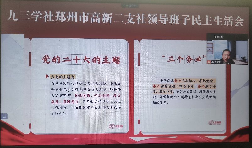 王崢、孫靜指出,疫情時期高新二支社線上召開民主生活會,學(xué)習(xí)中共二十大精神和社省委相關(guān)文件,加強政治學(xué)習(xí),分享感受體會,提升自身能力,效果很好。中共二十大是一次舉世矚目的盛會,目前社會各界都在學(xué)習(xí)二十大精神,希望高新二支社領(lǐng)導(dǎo)班子:一是始終堅定中國共產(chǎn)黨領(lǐng)導(dǎo),深刻領(lǐng)悟“兩個確立”的決定性意義,堅決做到“兩個維護”;二是繼承和發(fā)揚愛國、民主、科學(xué)的優(yōu)良傳統(tǒng),在社務(wù)活動中充分發(fā)揮自身特色優(yōu)勢;三是堅持中國共產(chǎn)黨領(lǐng)導(dǎo)的多黨合作和政治協(xié)商制度,積極參與政黨協(xié)商,著眼鄭州的發(fā)展大局建言獻策;四是不斷加強自身建設(shè),提升八種能力,錘煉四種作風(fēng),努力成為適應(yīng)新時代要求的高素質(zhì)九三學(xué)社社員。