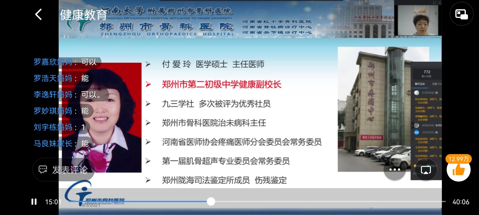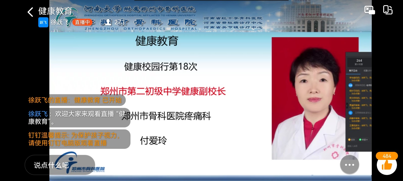 9月3日,九三學(xué)社鄭州市二七四支社主委付愛玲通過釘釘線上直播的方式,為鄭州市第二初級(jí)中學(xué)七年級(jí)新生舉辦了醫(yī)學(xué)健康科普知識(shí)講座。