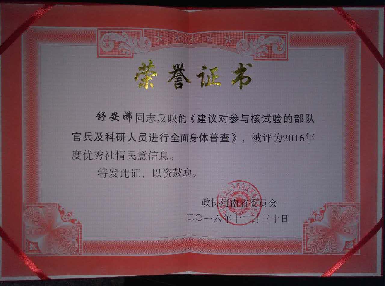 由社市委主委、全國政協(xié)委員舒安娜反映的《建議對參與核試驗的部隊官兵及科研人員進行全面身體普查》獲優(yōu)秀社情民意信息。