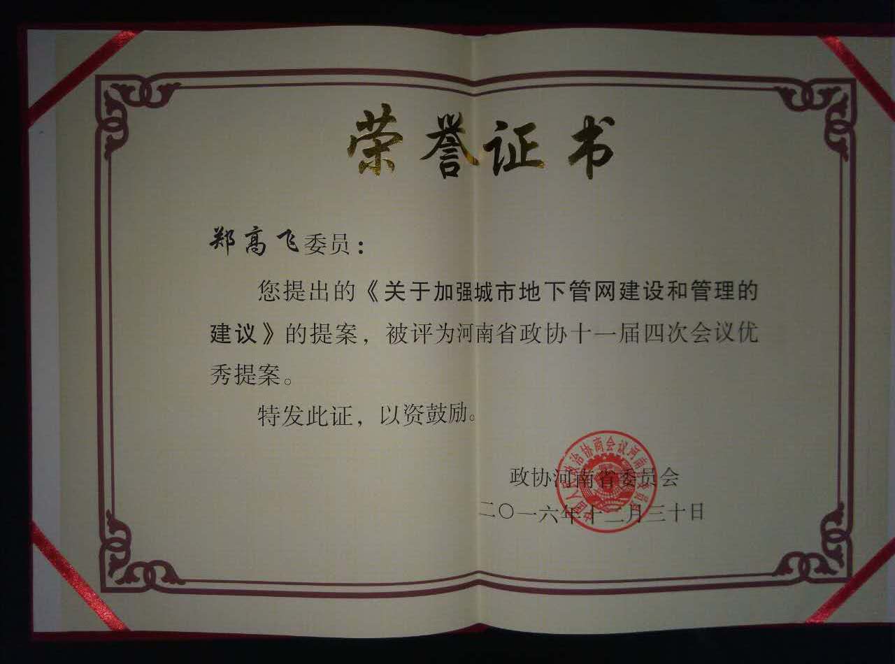 由社市委副主委、省政協(xié)常委鄭高飛在政協(xié)第十一屆河南省委員會第四次會議提出的《關于加強城市地下管網(wǎng)建設和管理的建議》被評為省政協(xié)第十一屆四次會議以來優(yōu)秀提案。該提案列為2016年省政協(xié)主席督辦提案。