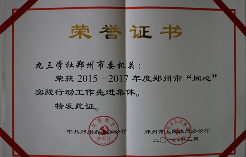 3月14日,鄭州市召開全市統(tǒng)戰(zhàn)工作會(huì)議。會(huì)議上表彰并通報(bào)了2015-2017年度鄭州市“同心”實(shí)踐行動(dòng)工作先進(jìn)集體和先進(jìn)個(gè)人。九三學(xué)社鄭州市委機(jī)關(guān)榮獲2015-2017年度鄭州市“同心”實(shí)踐行動(dòng)工作先進(jìn)集體,社市委辦公室主任尚秋霞榮獲2015-2017年度鄭州市“同心”實(shí)踐行動(dòng)工作先進(jìn)個(gè)人。